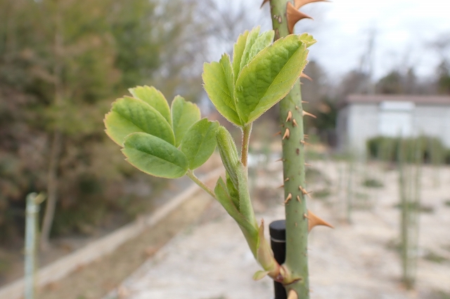 事務局前のローズの若葉が広がりました