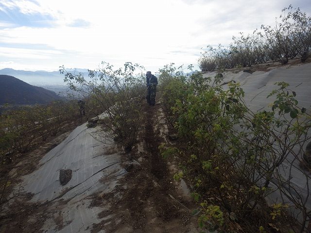 ローズ畑では防草シートの上に残った土を株元に戻す清掃作業が行われています