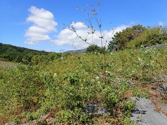 ローズ畑では厄介な雑草センダングサ(通称バカ)が背丈を超えるほどに伸び種を付け始めています