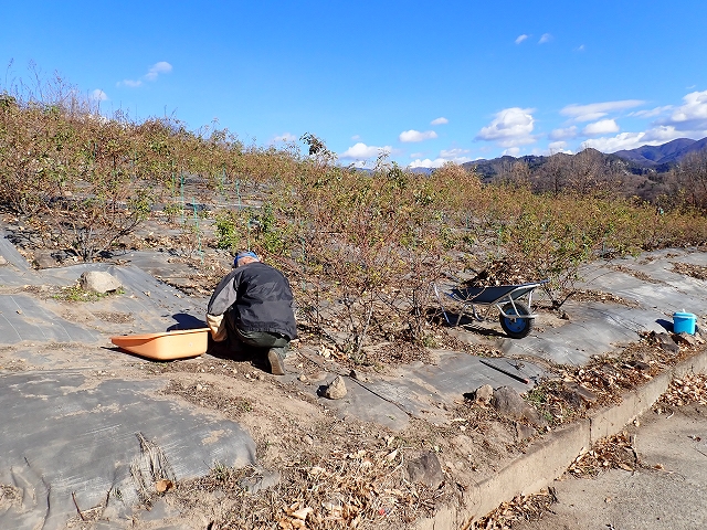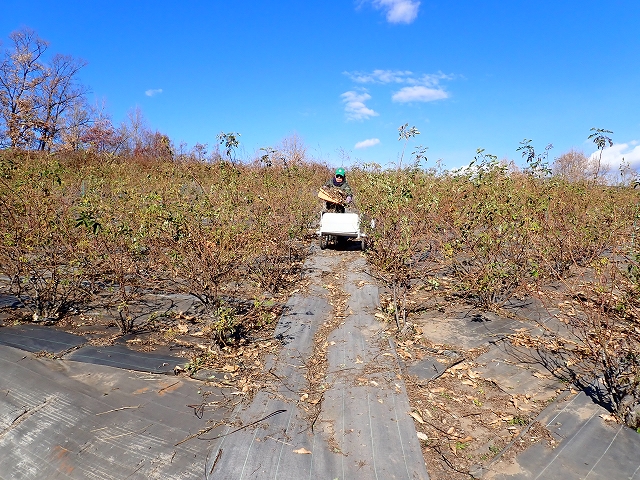 除草した草や舞って来た枯れ葉を畑の外へ運ぼ出しています