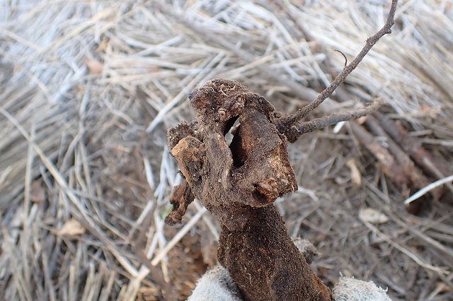 枯れた枝の株元はカミキリムシかコガネムシの幼虫に食べられた跡がありました