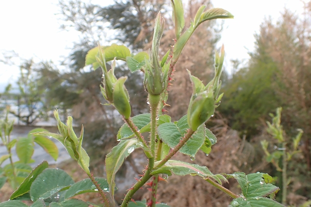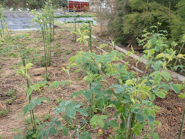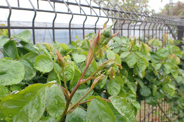 事務局前のつるバラも蕾を次々に立ち上げています