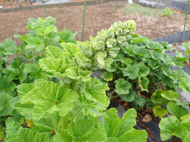 ブラックマロウの花柱が立ち上がり蕾が上がってきました